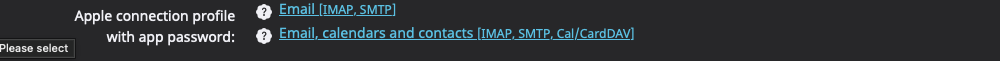 Avautuvalta sivulta kohdasta "Apple connection profile with app password" valitse alempi linkki "Email, calendars and contacts [IMAP, SMTP, Cal/CardDAV]":