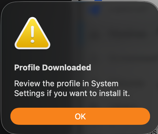 MacOS tietokoneella avautuu ilmoitus profiilin latauksesta: