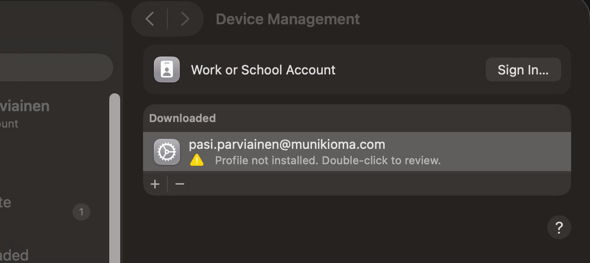 Avaa ohjeitten mukaan asetukset (Apple logo menusta → System Settings → General → Device Management). Näkymässä pitäisi olla keltaisella varoitusmerkillä asennettava profiili. Tuplaklikkaa sitä aloittaaksesi asennuksen.
