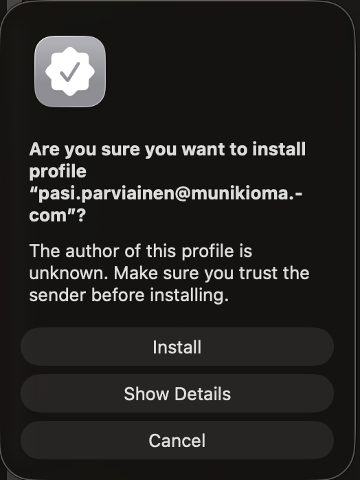 MacOS tietokoneella avautuu ilmoitus profiilin latauksesta: